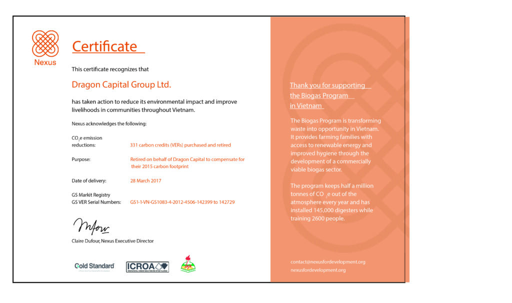 Dragon Capital Group (DCG) announced that it had offset all of annual carbon emissions by purchasing Voluntary Emission Reduction – VERs certificate from a biogas project in Vietnam rural area.