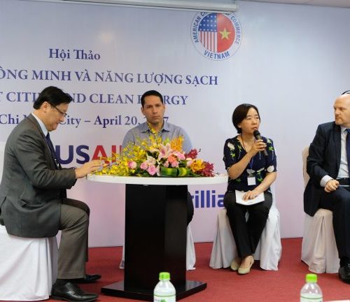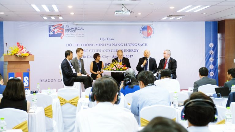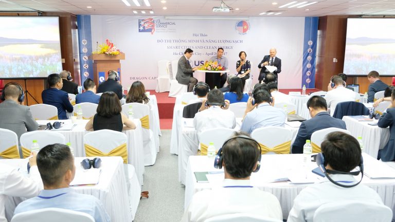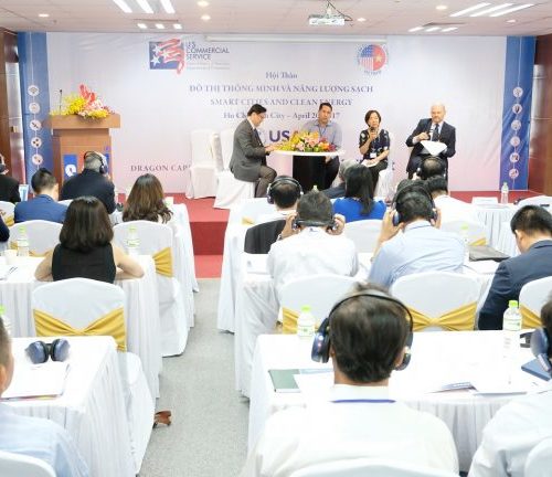 Among those attending the workshop were officials from the People’s Committee, key city government departments, and key urban infrastructure authorities. The program featured a presentation of the results of a pilot smart grid project that U.S. company Trilliant and EVN jointly sponsored at SHTP. It also featured panels by companies presenting on clean energy and smart cities technologies and solutions. Panels covered a range of subjects such as energy efficiency, renewable energy, and case studies of smart city solutions that have been applied in Singapore by U.S. companies. Dragon Capital was proud to be a part of this event.