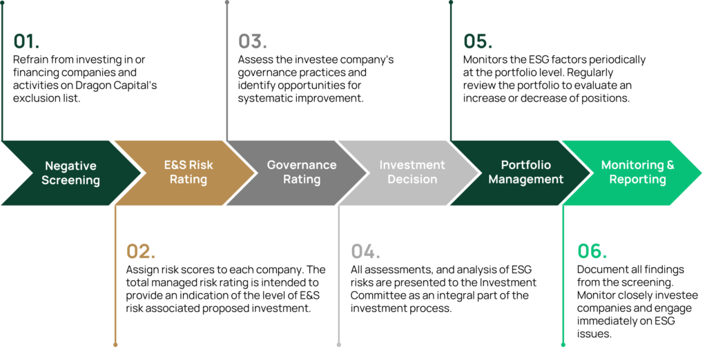 - Potential companies undergo pre-screening against the Fund’s exclusion list. If they pass the eligibility criteria, the proprietary ESG Management System (ESGM) developed by Dragon Capital Group (DCG) (of which the Investment Manager is a group company) evaluates the potential companies’ ESG performance. Based on the screening results, these companies receive managed risk ratings of E&S performance: Excellent, Good, Average, Need Improvement, or Inadmissible.